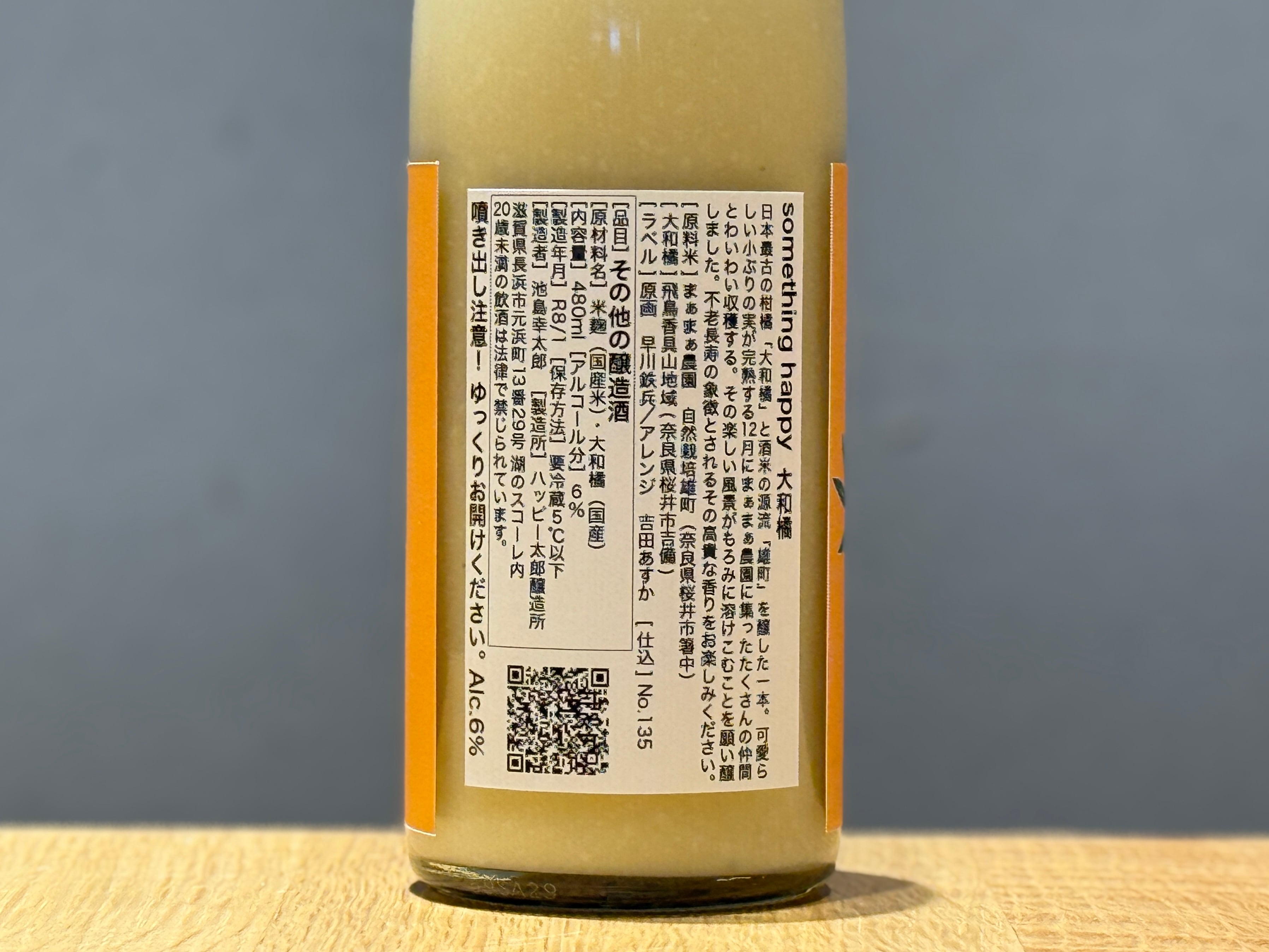 日本最古の柑橘「大和橘」と酒米の源流「雄町」を醸した一本。可愛らしい小ぶりの実が完熟する12月にまぁまぁ農園に集ったたくさんの仲間がわいわい収穫される、その楽しい風景がもろみに溶けこむことを願い醸しました。不老長寿の象徴とされるその高貴な香りをお楽しみください。